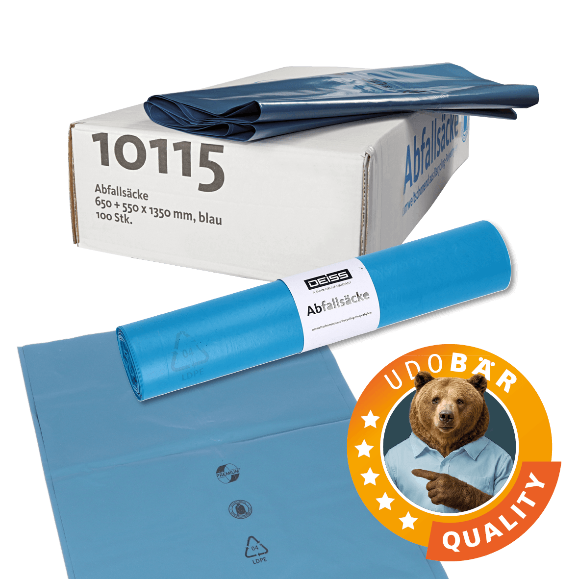 De scheurvaste UDO BÄR-afvalzakken zorgen in kantoor en industrie voor een betrouwbare, hygiënische afvalverwerking – sterk belastbaar, in verschillende maten en diktes.